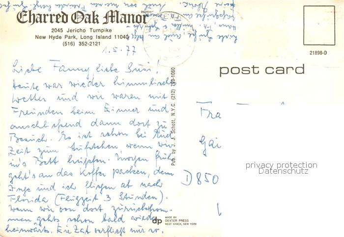 73025675 old postcard New Hyde Park Charred Oak Manor postalisch gelaufen Erhaltung siehe scans [KathaD81] KatCode: 14140340000000
