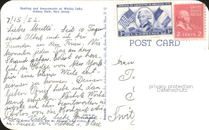 11693040 old postcard New Jersey Boating at Wesley Lake postalisch gelaufen Erhaltung siehe scans KatCode: 14140