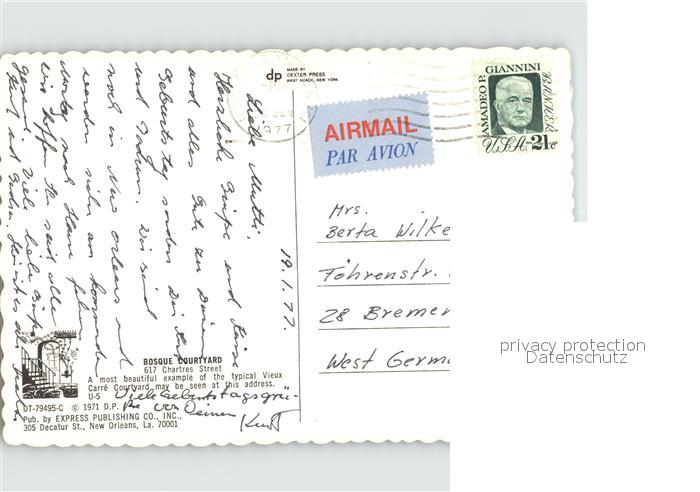 72432095 old postcard New Orleans Louisiana Bosque Courtyard postalisch gelaufen Erhaltung siehe scans KatCode: 14140200000000