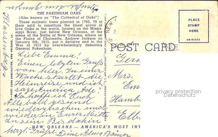 71911719 old postcard New Orleans Louisiana Pakenham Oaks postalisch gelaufen Erhaltung siehe scans KatCode: 14140200000000