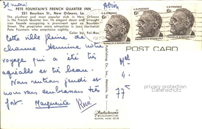 71966174 old postcard New Orleans Louisiana Pete Fountains French Quarter Inn postalisch gelaufen Erhaltung siehe scans KatCode: 14140200000000