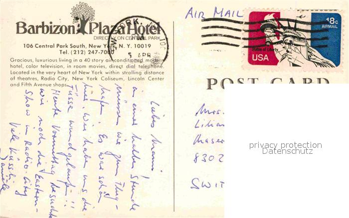 72671393 old postcard New York City Barbizon Plaza Hotel postalisch gelaufen Erhaltung siehe scans [WerneD78] KatCode: 14140340000000