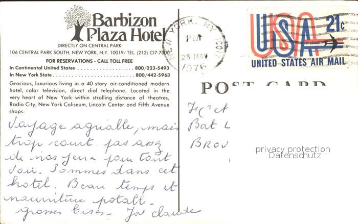 71953210 old postcard New York City Barbizon Plaza Hotel postalisch gelaufen KatCode: 14140340000000
