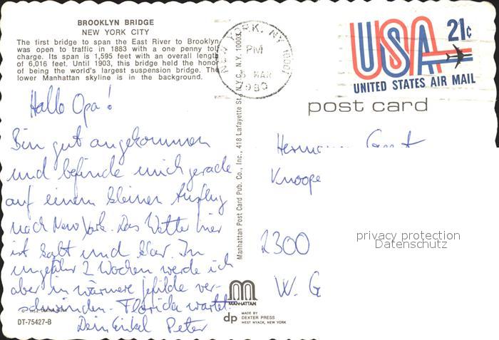 72330107 old postcard New York City Brooklyn Bridge postalisch gelaufen Erhaltung siehe scans KatCode: 14140340000000