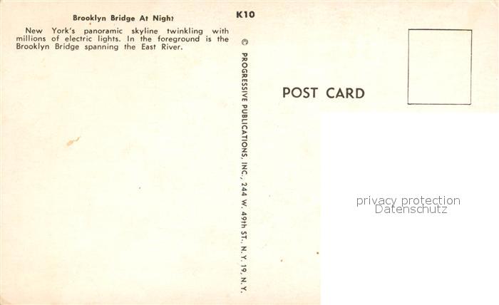 73123517 New York City Brooklyn Bridge East River Manhattan at night postalisch nicht gelaufen Erhaltung siehe scans [FriedD77] KatCode: 14140340000000
