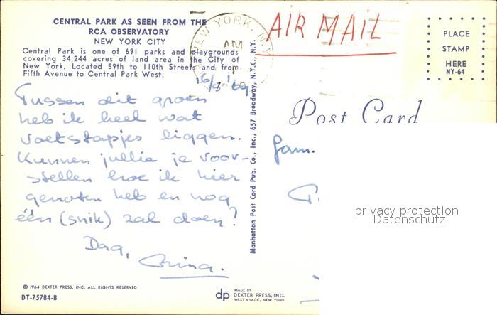 72291533 old postcard New York City Central Park Seen RCA Observatory postalisch gelaufen Erhaltung siehe scans KatCode: 14140340000000