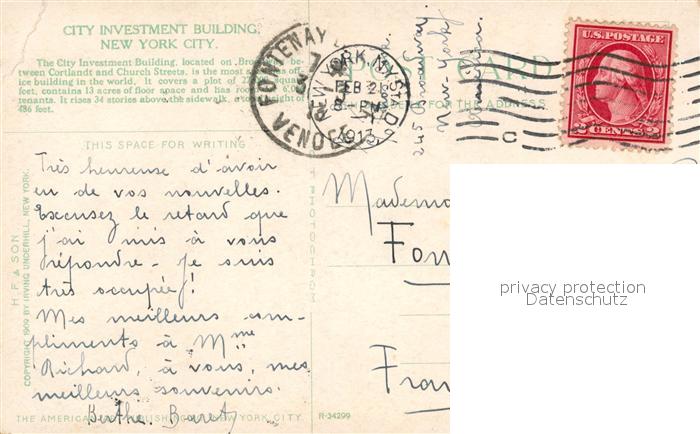 73508383 old postcard New York City City Investment Building postalisch gelaufen Erhaltung siehe scans [WerneD78] KatCode: 14140340000000