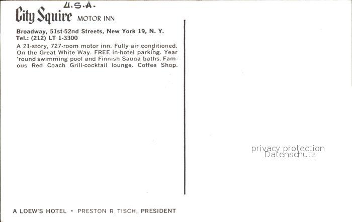 72118734 New York City City Squire Motor Inn Hotel postalisch nicht gelaufen Erhaltung siehe scans KatCode: 14140340000000