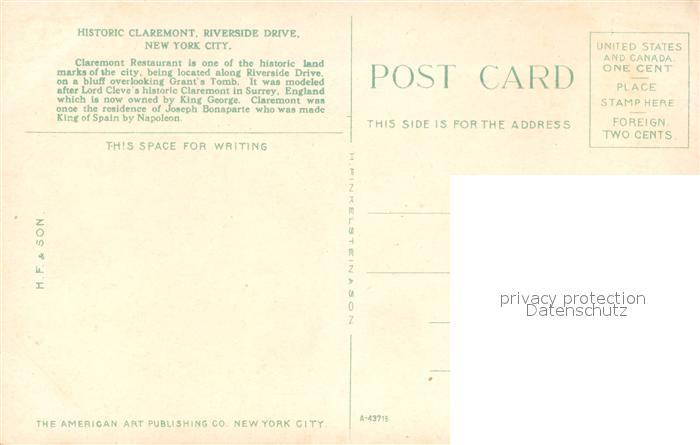 73588783 New York City Claremont Restaurant Historic Claremont Riverside Drive postalisch nicht gelaufen Erhaltung siehe scans [FriedD77] KatCode: 14140340000000