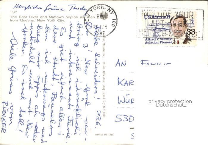 71668975 old postcard New York City East River and Midtown skyline from Queens postalisch gelaufen Erhaltung siehe scans KatCode: 14140340000000