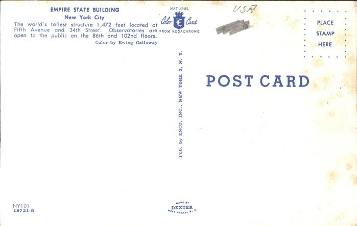 11491622 New York City Empire State Building Skyscraper postalisch nicht gelaufen Erhaltung siehe scans KatCode: 14140340000000