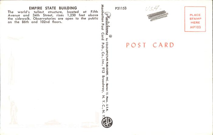 11491609 New York City Empire State Building Skyscraper postalisch nicht gelaufen Erhaltung siehe scans KatCode: 14140340000000