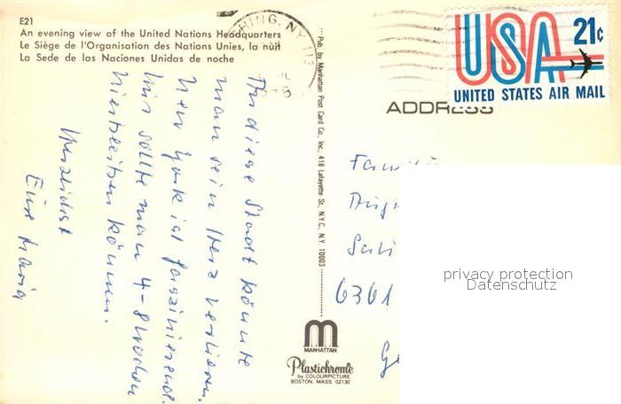 73146741 old postcard New York City Evening view of United Nations Headquarters Building postalisch gelaufen Erhaltung siehe scans [FriedD77] KatCode: 14140340000000