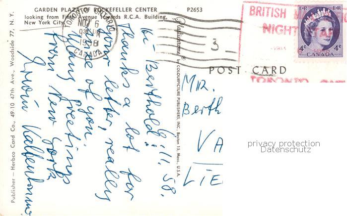 73860777 old postcard New York City Garden Plaza of Rockefeller Center postalisch gelaufen Erhaltung siehe scans [WerneD78] KatCode: 14140340000000