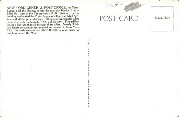 11491627 New York City General Post Office postalisch nicht gelaufen Erhaltung siehe scans KatCode: 14140340000000