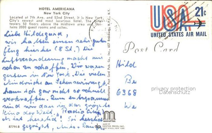 72342164 old postcard New York City Hotel Americana postalisch gelaufen Erhaltung siehe scans KatCode: 14140340000000