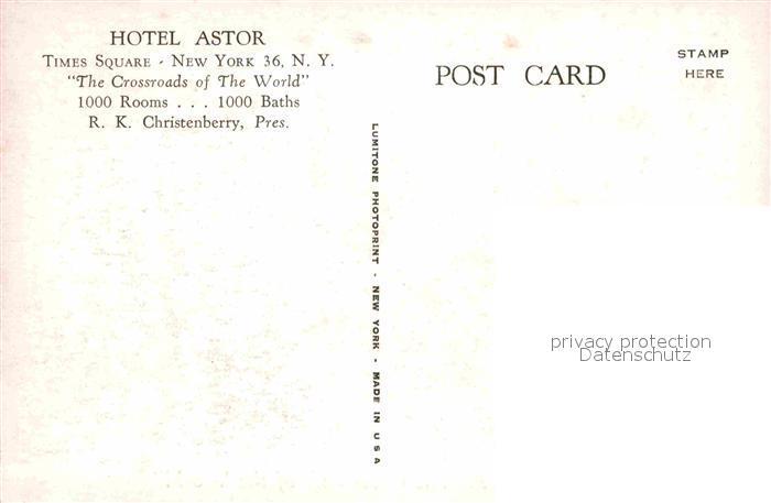 72614734 New York City Hotel Astor At The Crossroads of the World postalisch nicht gelaufen Erhaltung siehe scans [WerneD78] KatCode: 14140340000000