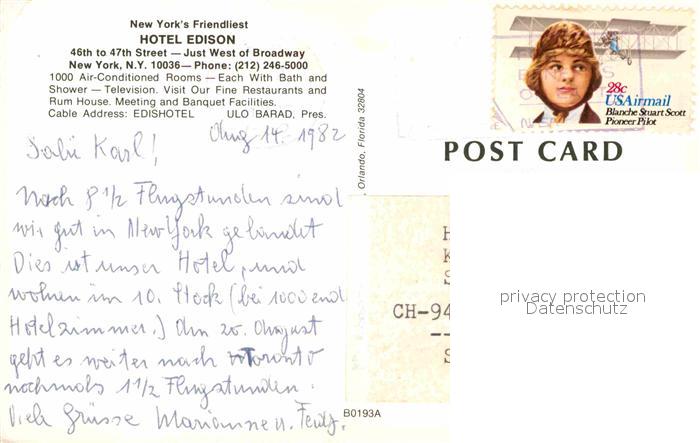 72706691 old postcard New York City Hotel Edison postalisch gelaufen Erhaltung siehe scans [LiesaD40] KatCode: 14140340000000