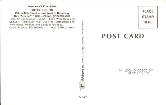 72259288 New York City Hotel Edison at night postalisch nicht gelaufen Erhaltung siehe scans KatCode: 14140340000000