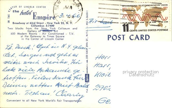 72314046 old postcard New York City Hotel Empire Lincoln Center postalisch gelaufen Erhaltung siehe scans KatCode: 14140340000000