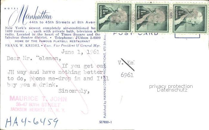 72054975 old postcard New York City Hotel Manhattan postalisch gelaufen Erhaltung siehe scans KatCode: 14140340000000