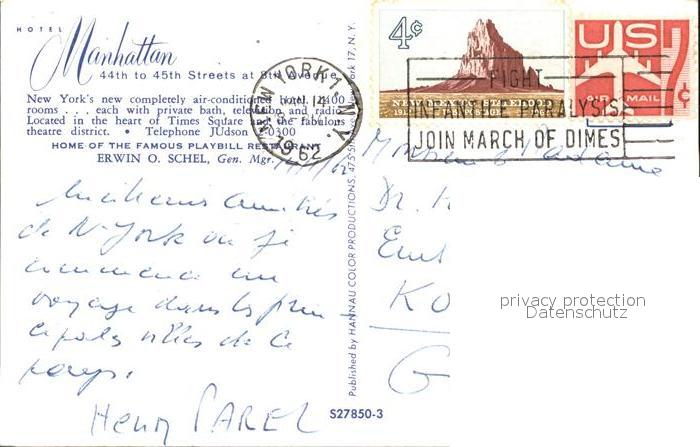 11693249 old postcard New York City Hotel Manhattan postalisch gelaufen Erhaltung siehe scans KatCode: 14140340000000