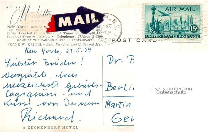 73661082 old postcard New York City Hotel Manhattan Illustration postalisch gelaufen Erhaltung siehe scans [FriedD77] KatCode: 14140340000000