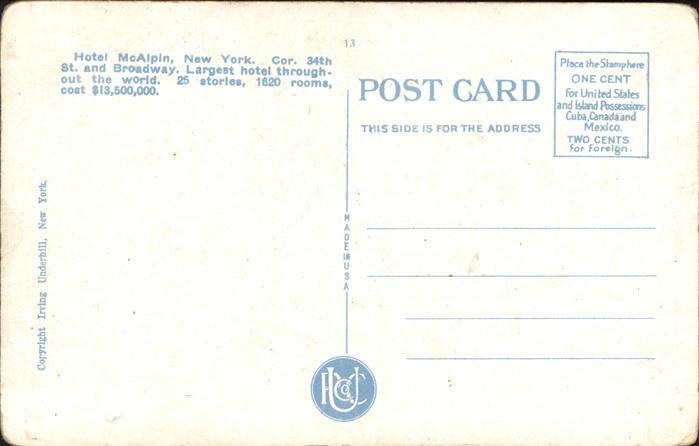11111774 New York City Hotel Mc Alpin Strassenbahn postalisch nicht gelaufen KatCode: 14140340000000