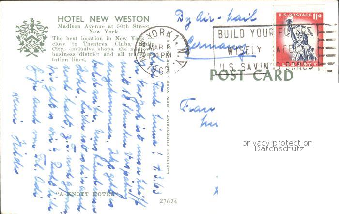 72246399 old postcard New York City Hotel New Weston postalisch gelaufen Erhaltung siehe scans KatCode: 14140340000000