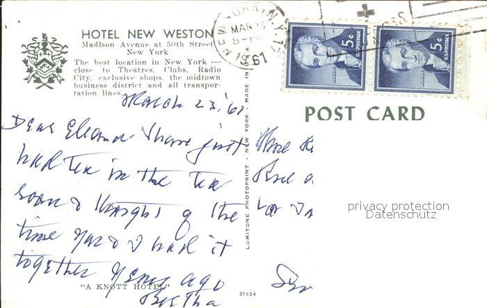 72282063 old postcard New York City Hotel New Weston postalisch gelaufen Erhaltung siehe scans KatCode: 14140340000000