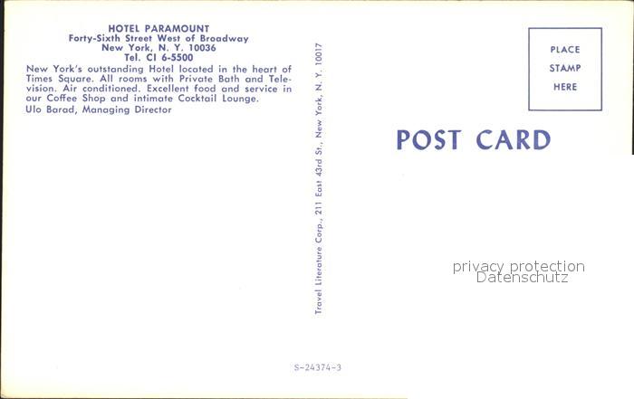 72253113 New York City Hotel Paramount postalisch nicht gelaufen Erhaltung siehe scans KatCode: 14140340000000