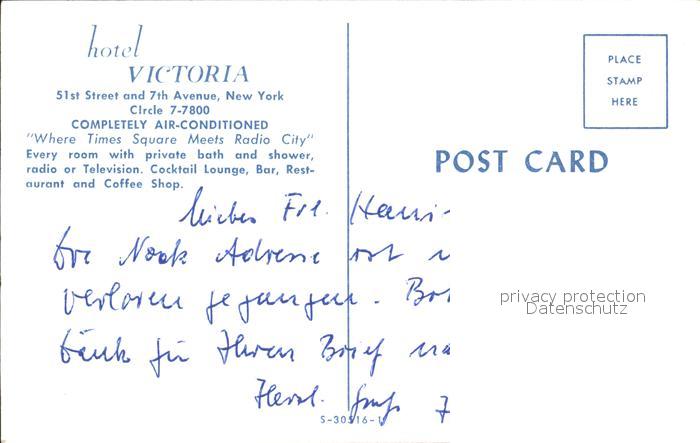 72246397 New York City Hotel Victoria postalisch nicht gelaufen Erhaltung siehe scans KatCode: 14140340000000