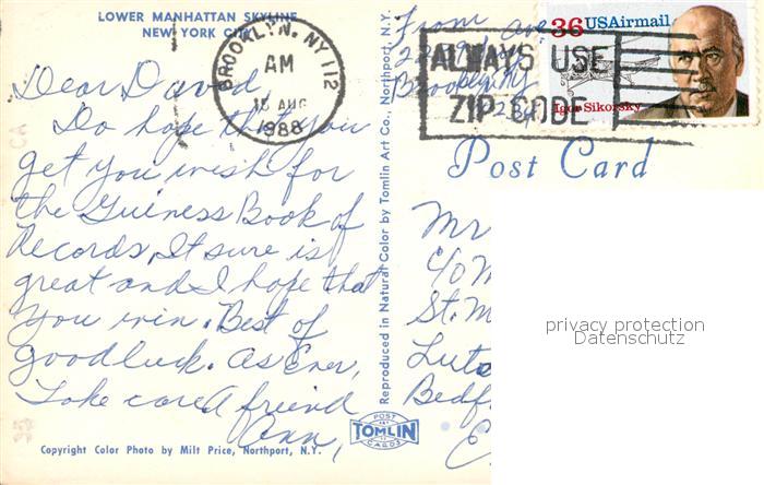 73061493 old postcard New York City Lower Manhattan Skyline postalisch gelaufen Erhaltung siehe scans [WerneD78] KatCode: 14140340000000