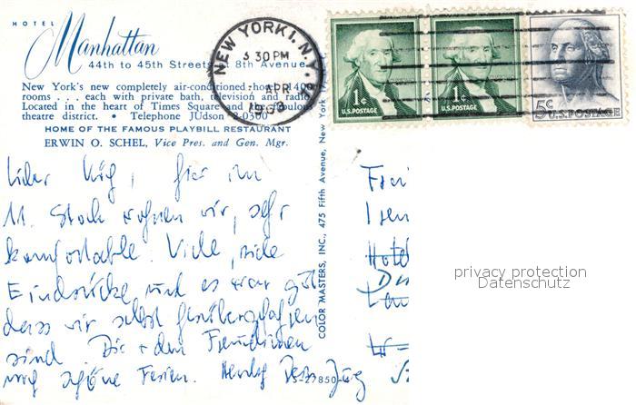 72925428 old postcard New York City Manhattan Hotel postalisch gelaufen Erhaltung siehe scans [NatalD47] KatCode: 14140340000000