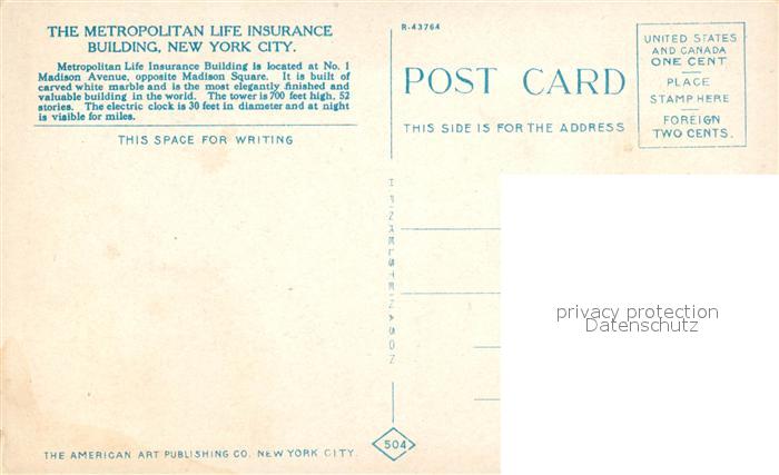 73588844 New York City Metropolitan Life Insurance Building postalisch nicht gelaufen Erhaltung siehe scans [FriedD77] KatCode: 14140340000000