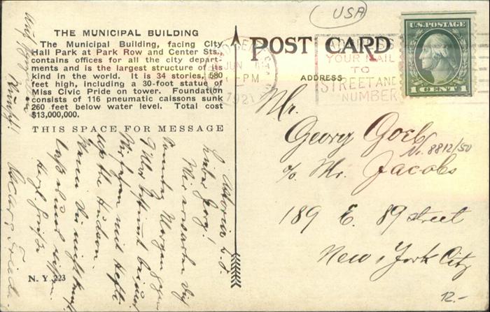 11032216 old postcard New York City Municipal Building postalisch gelaufen KatCode: 14140340000000
