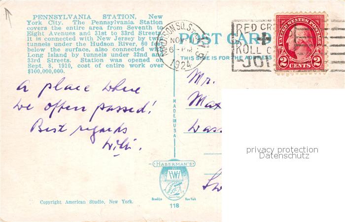 73827659 old postcard New York City Pennsylvania Station postalisch gelaufen Erhaltung siehe scans [FriedD77] KatCode: 14140340000000