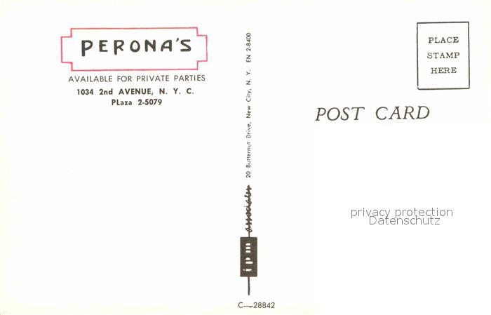 72826502 New York City Perona’s Restaurant postalisch nicht gelaufen Erhaltung siehe scans [PaolaD17] KatCode: 14140340000000