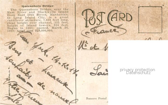 73812543 old postcard New York City Queensboro Bridge postalisch gelaufen Erhaltung siehe scans [FriedD77] KatCode: 14140340000000