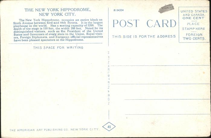 11322695 New York City The Hippodrome postalisch nicht gelaufen gute Erhaltung KatCode: 14140340000000