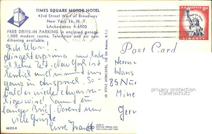 32513010 old postcard New York City Times Square Motor Hotel postalisch gelaufen Erhaltung siehe scans KatCode: 14140340000000
