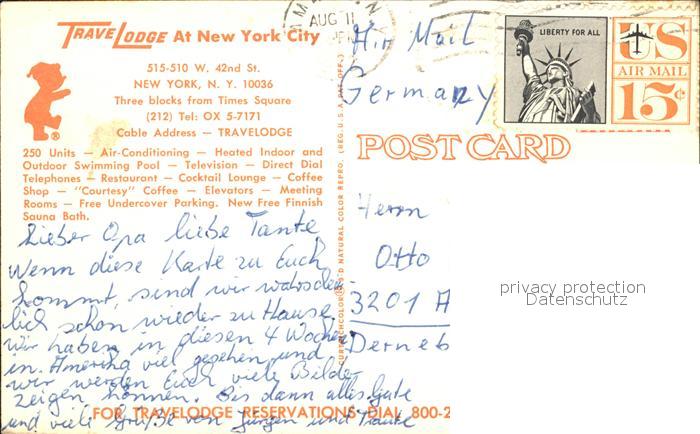 72415883 old postcard New York City Trave Lodge postalisch gelaufen Erhaltung siehe scans KatCode: 14140340000000