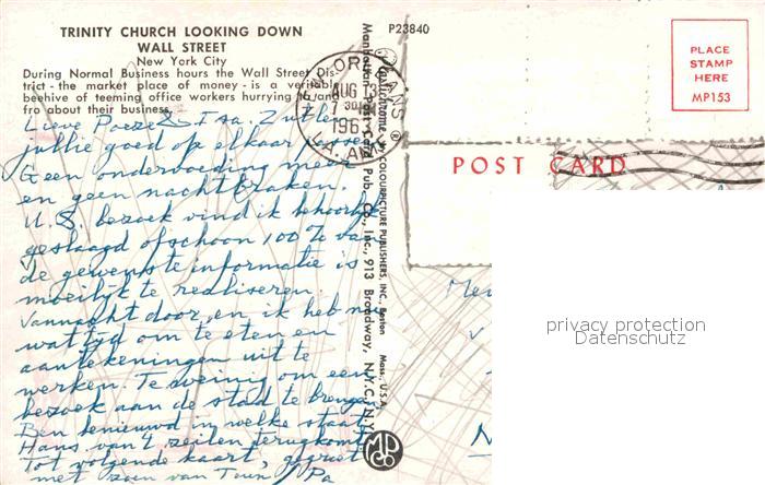 72748236 old postcard New York City Trinity Church Looking Down postalisch gelaufen Erhaltung siehe scans [KathaD81] KatCode: 14140340000000