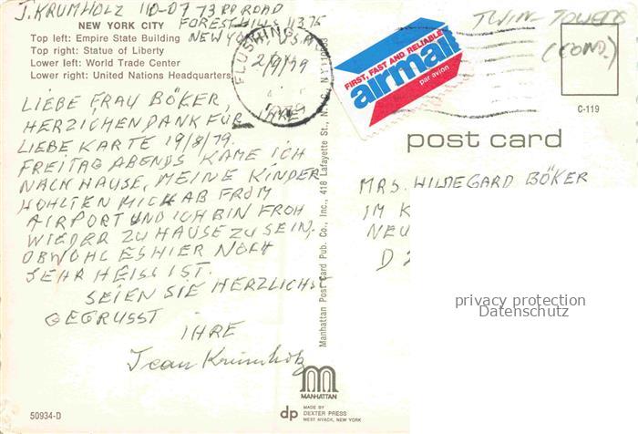 74153486 old postcard NEW YORK City USA Empire State Building Statue of Liberty World Trade Center United Nations Headquarters postalisch gelaufen Erhaltung siehe scans [FriedD77] KatCode: 14140340000000