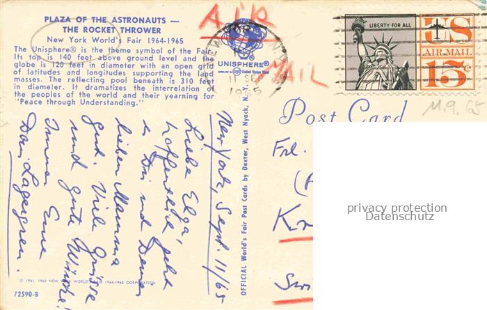 74118038 old postcard NEW YORK City USA Plaza of the Astronauts The Rocket Thrower postalisch gelaufen Erhaltung siehe scans [WerneD78] KatCode: 14140340000000
