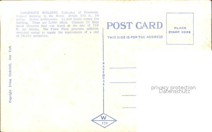 11693251 New York City Woolworth Building postalisch nicht gelaufen Erhaltung siehe scans KatCode: 14140340000000