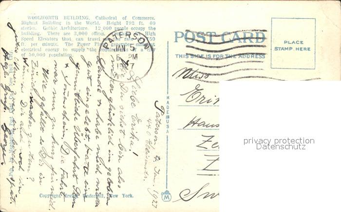 11686157 old postcard New York City Woolworth Building postalisch gelaufen Erhaltung siehe scans KatCode: 14140340000000