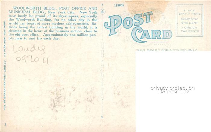 73588861 New York City Woolworth Building Post Office and Municipal Building postalisch nicht gelaufen Erhaltung siehe scans [FriedD77] KatCode: 14140340000000