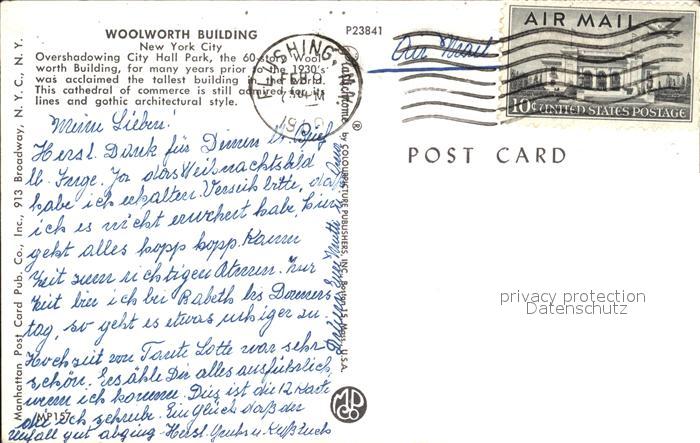 72428634 old postcard New York City Woolworth Gebaeude postalisch gelaufen Erhaltung siehe scans KatCode: 14140340000000