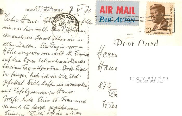 73716563 old postcard Newark New Jersey City Hall postalisch gelaufen Erhaltung siehe scans [FriedD77] KatCode: 14140320000000
